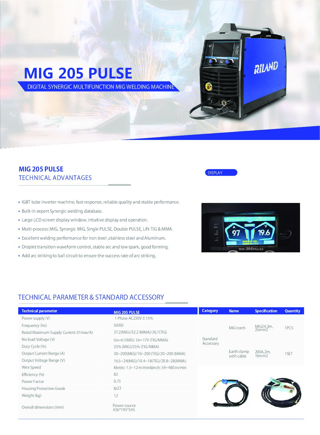 Zvárací poloautomat MIG 205 PLUSLE RILAND je malý prenosný, určený na zváranie priamo na zákazkách a aj na dielni. Napájanie je 1 x AC 230V a je určený na malé 5kg cievky ( D200 ), poprípade 1 kg cievky bez ochranného plynu. Dá sa s ním zvárať aj obalenou elektródou ( MMA ) alebo kontaktným TIGom. Je to viacúčelové zariadenie – Multi-process: MIG, Synergic MIG, Single PULSE, Double PULSE, . Maximálny zvárací prúd je 200 A pri metóde MIG/MAG, TIG aj MMA. Má veľký LCD displej s intuitívnym ovládaním.